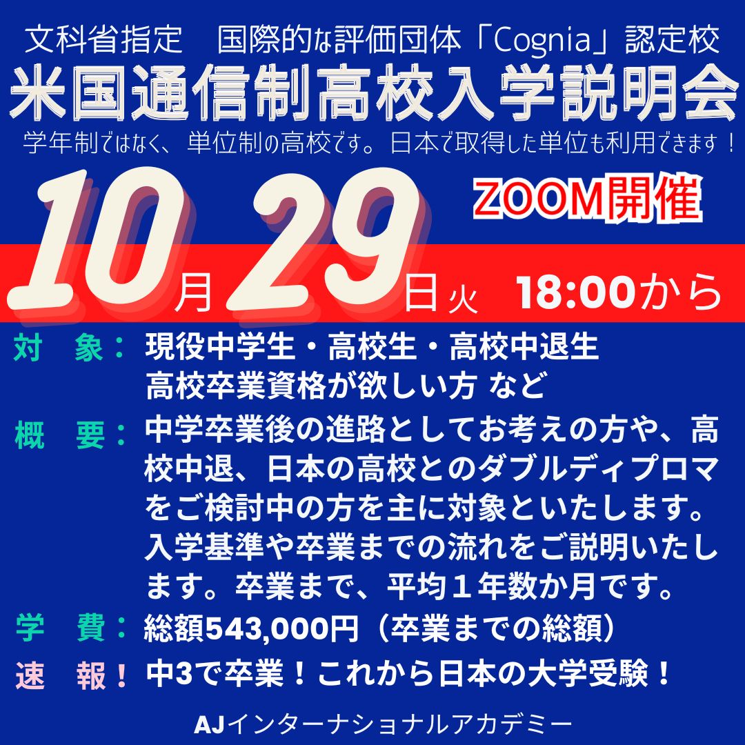 来る10月29日(火曜日)18時00分から、「米国通信制高校学校説明会」を開催いたしますので、ご案内させて頂きます。