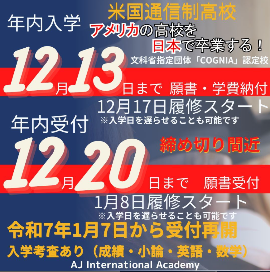 2024年12月10日 / 最終更新日時 : 2024年12月16日 InternationalAJ お知らせ 願書締め切り 年内の入学の願書は、12月13日まで。 年内の願書受付は、12月20日まで(年明け入学)。 入学をお考えの方は、お早めにご出願ください。
